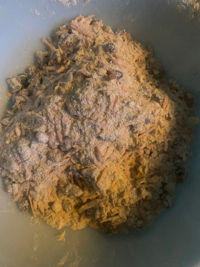 4. Gently fold in the grated carrots, raisins, and chopped nuts (if using) until evenly distributed.