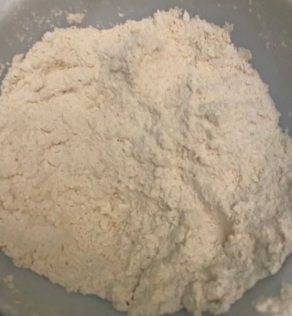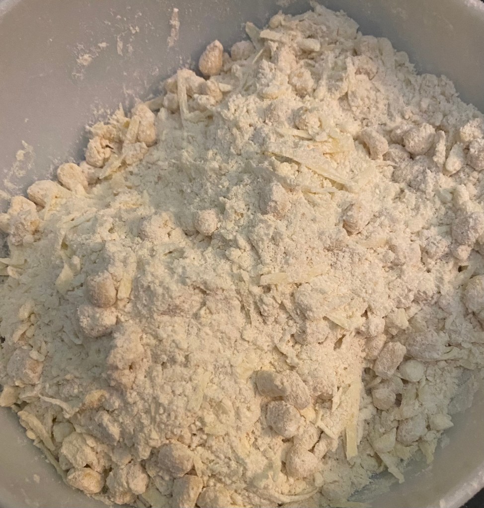 3. Add the cold, cubed butter to the flour mixture and use a pastry cutter or your fingers to blend until the mixture resembles coarse crumbs.