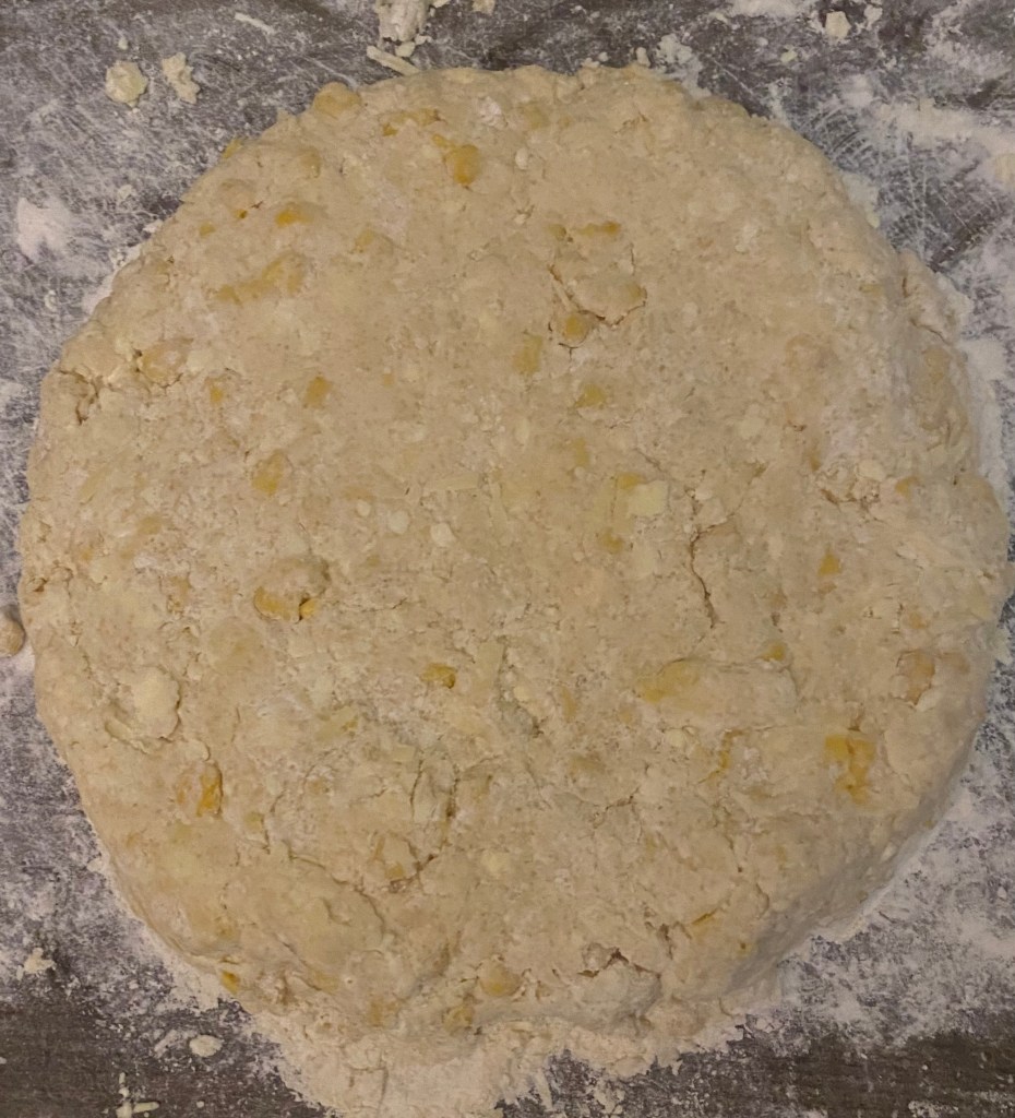 6. Turn the dough out onto a lightly floured surface and knead gently a few times until it comes together. Pat the dough into a circle about 1-inch thick.