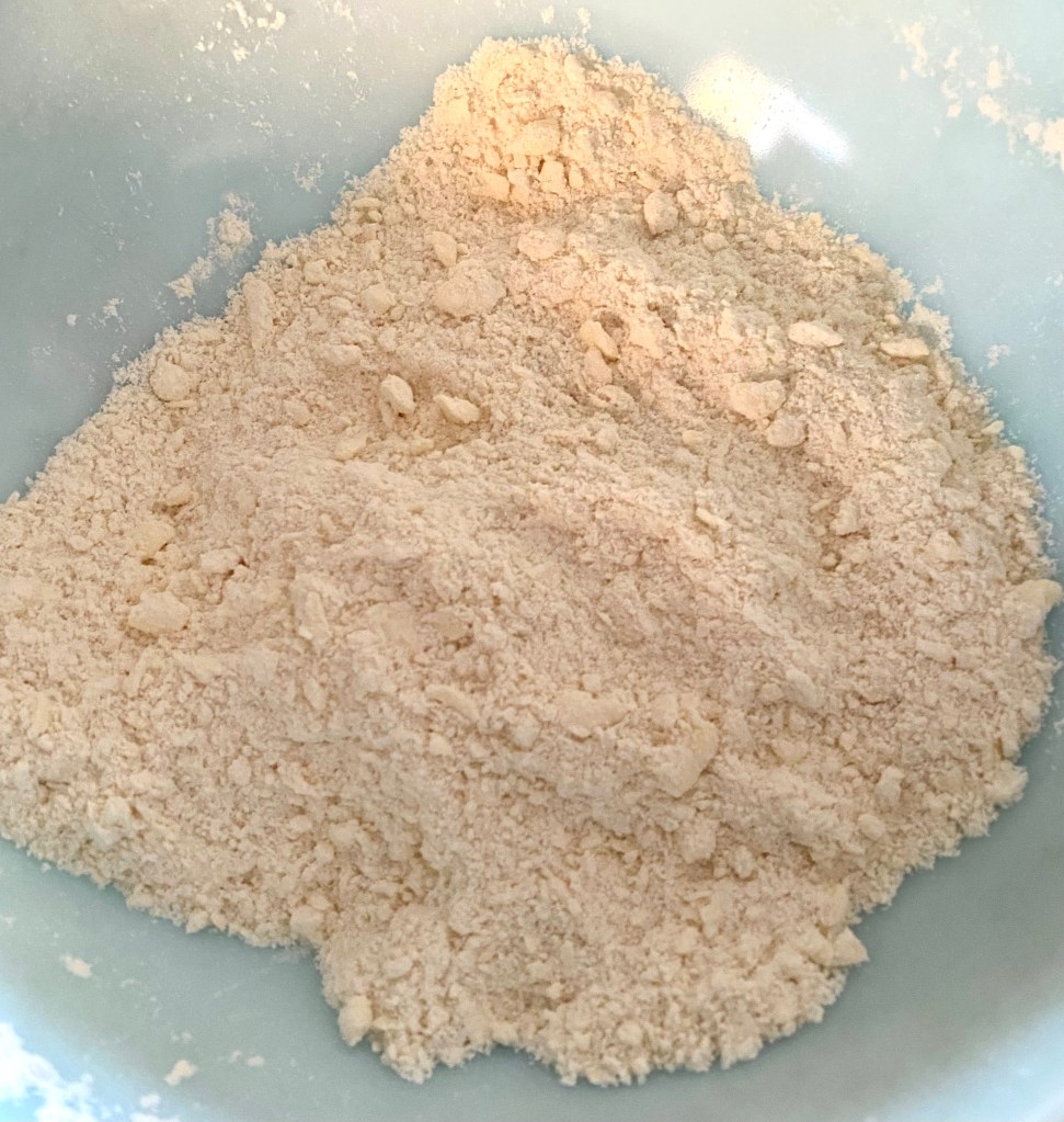 3. Add the cold, cubed butter to the dry ingredients and use a pastry cutter or your fingers to work it into the flour until the mixture resembles coarse crumbs.