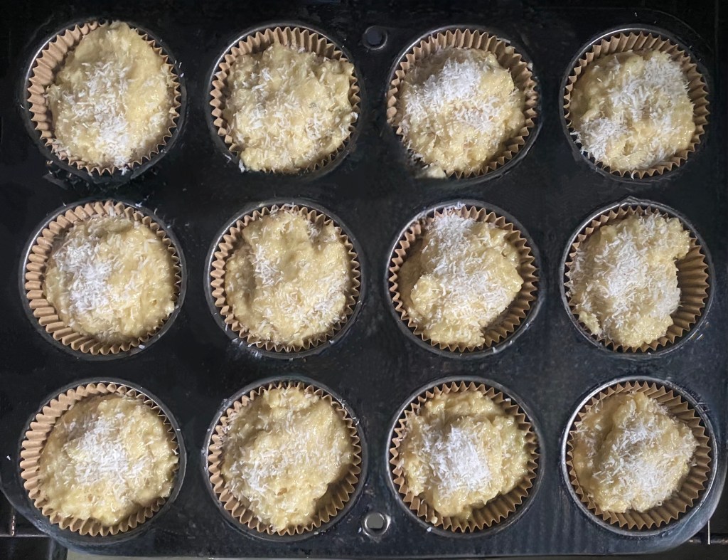 5. Divide the batter evenly among the muffin cups, filling each about 2/3 full. If desired, sprinkle a little extra shredded coconut on top for added texture.