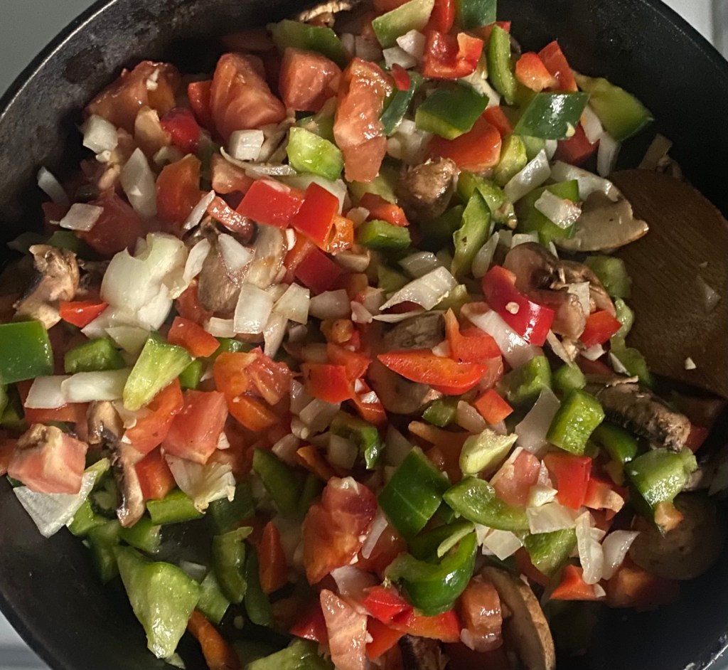 - In a skillet over medium heat, cook the onion, garlic, red pepper, green pepper, tomato, and mushrooms in olive oil until tender. add in parsley and mix.