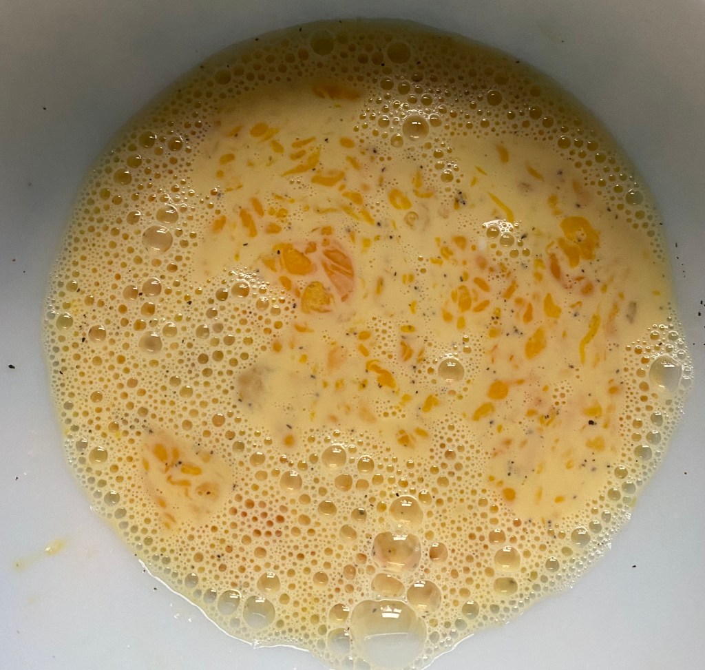 - In a mixing bowl, whisk together the eggs, heavy cream, salt, and pepper.