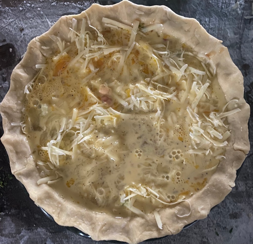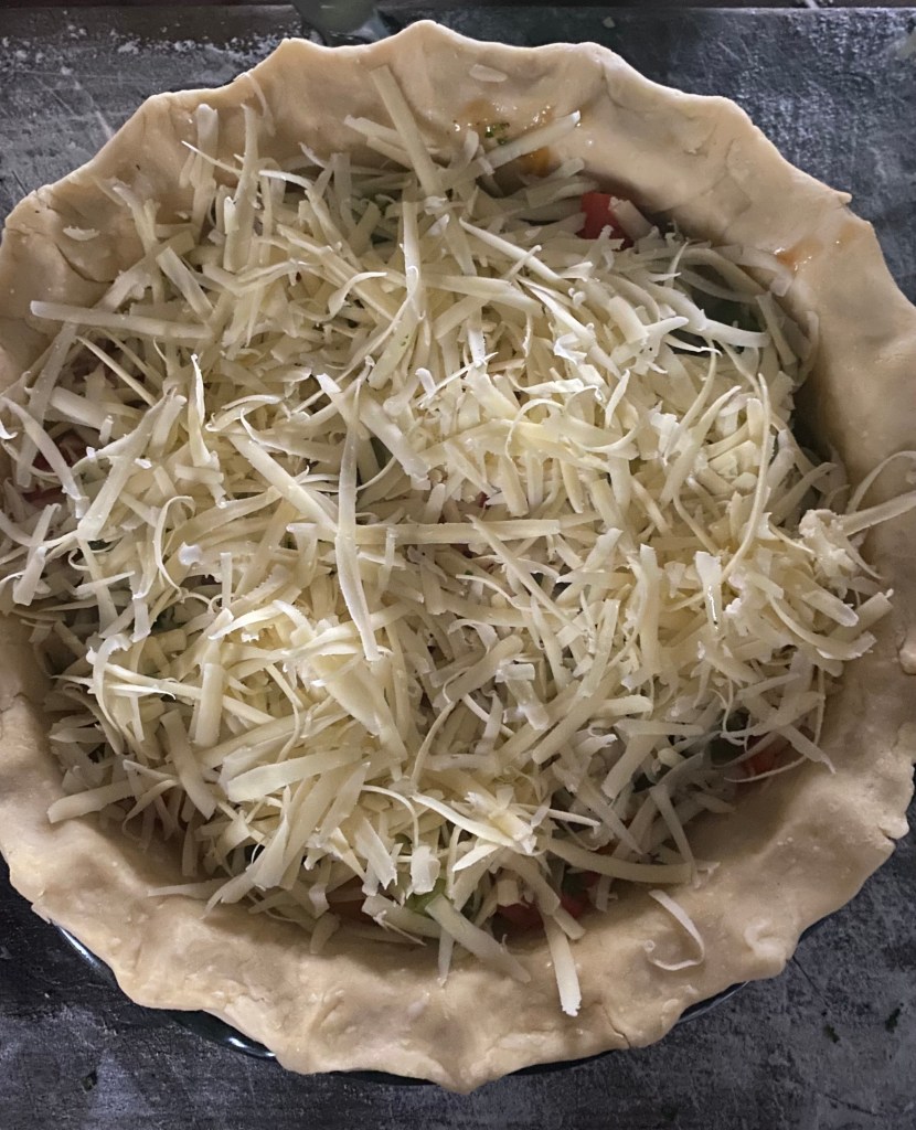 - Spread the vegatables evenly over the bottom of the baked crust. Top with the shredded cheese, then pour the egg mixture over the filling, ensuring everything is evenly distributed.