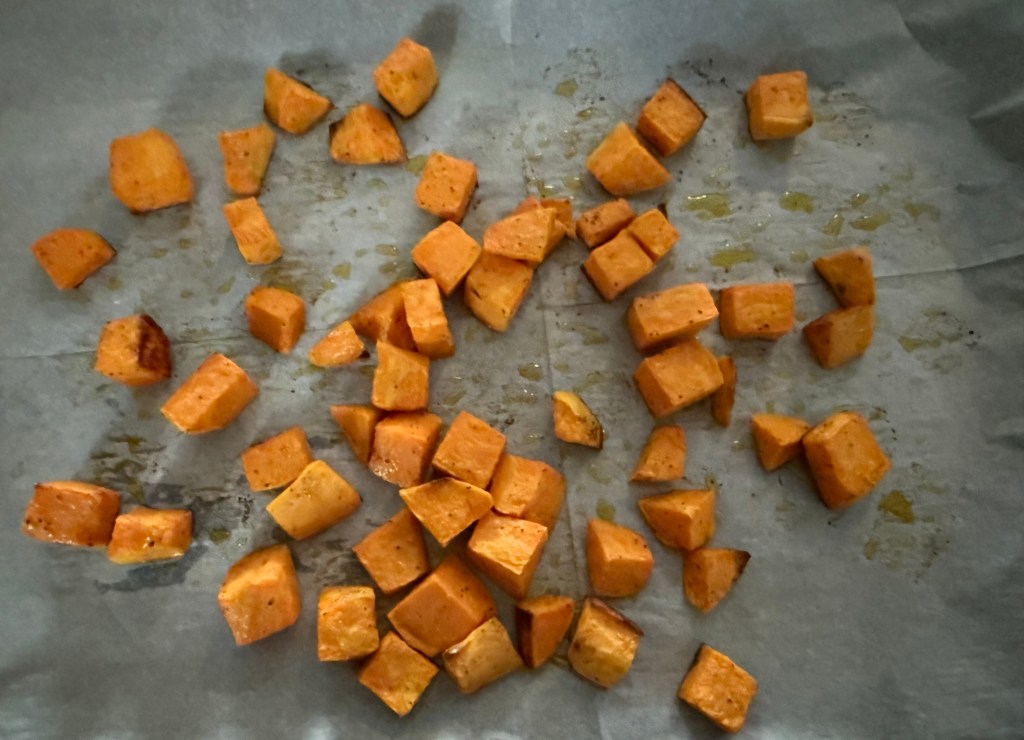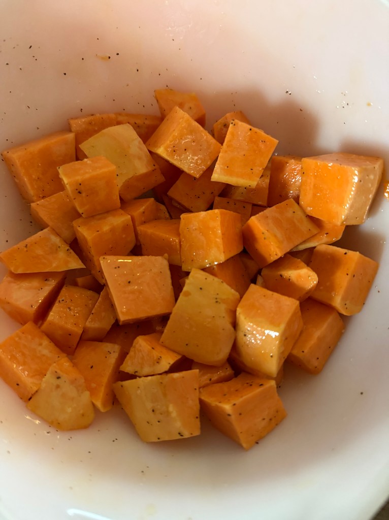 2. In a bowl, toss the diced sweet potato with olive oil, salt, and pepper. Spread the sweet potatoes on the baking sheet in a single layer and roast for about 25-30 minutes, or until tender and lightly browned, turning halfway through.