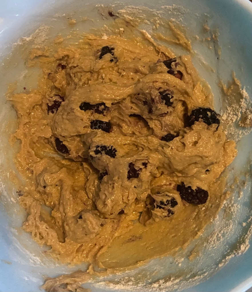 4. Pour the wet ingredients into the dry ingredients and stir until just combined; be careful not to overmix. Gently fold in the blackberries.