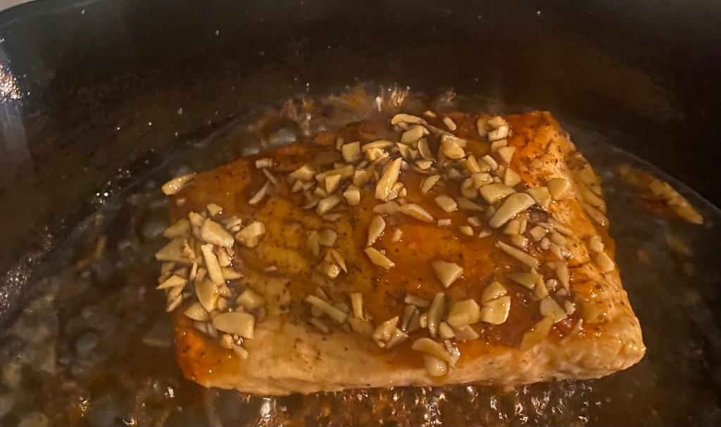 6. Pour the honey garlic mixture over the salmon fillets in the skillet and cook for an additional 1-2 minutes, allowing the sauce to thicken slightly.