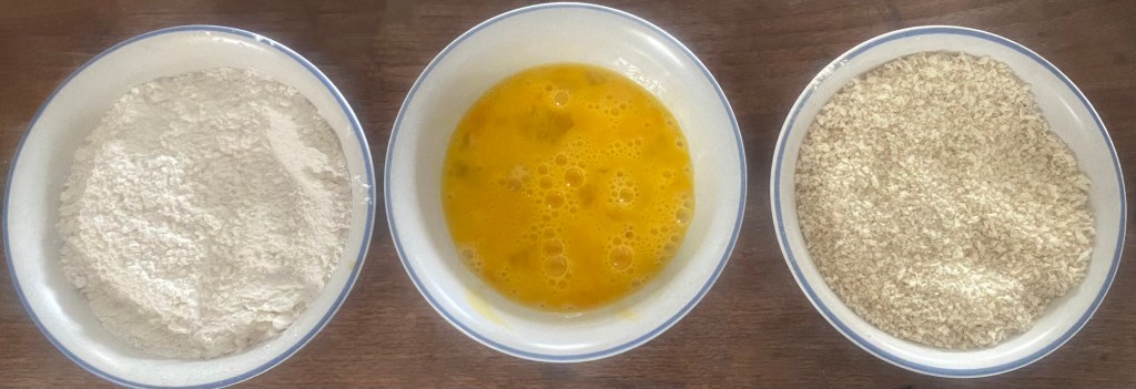 2. Set up a breading station with three shallow bowls: one with flour, one with beaten eggs, and one with panko breadcrumbs mixed with garlic powder, chili powder, salt, and pepper.
