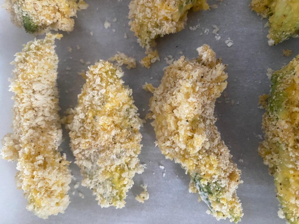 4. If baking, place the coated avocado fries on a baking sheet lined with parchment paper. Spray them lightly with olive oil for extra crispiness. Bake for about 15-20 minutes, flipping halfway, until they are golden brown and crispy.