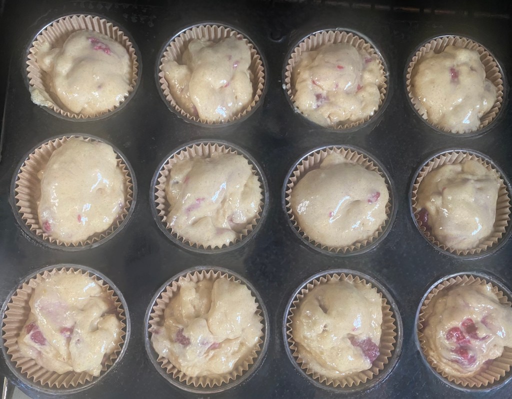 5. Gently fold in the raspberries, ensuring they are evenly distributed throughout the batter.