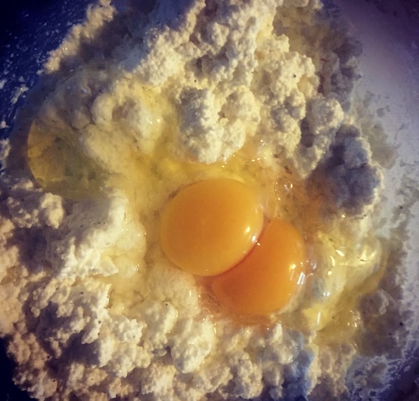 In a bowl combine 2 cups of ricotta cheese with half a teaspoon of salt, half a teaspoon of black pepper, and 2 eggs.