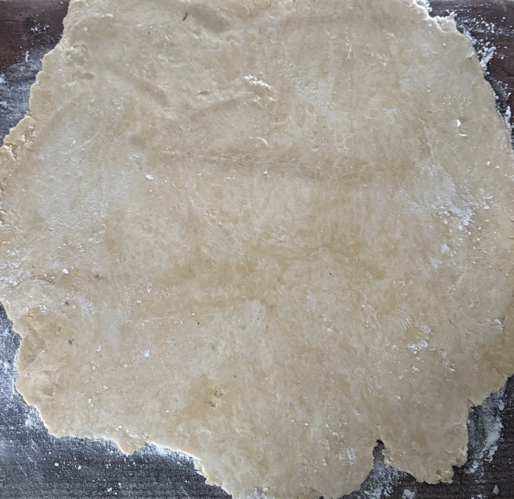 6. Roll out the dough: On a floured surface, roll out the chilled dough into a rough circle about 12 inches in diameter. Transfer it to the prepared baking sheet.