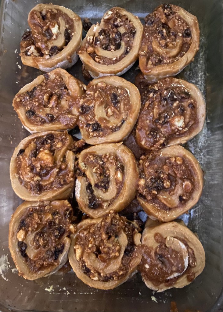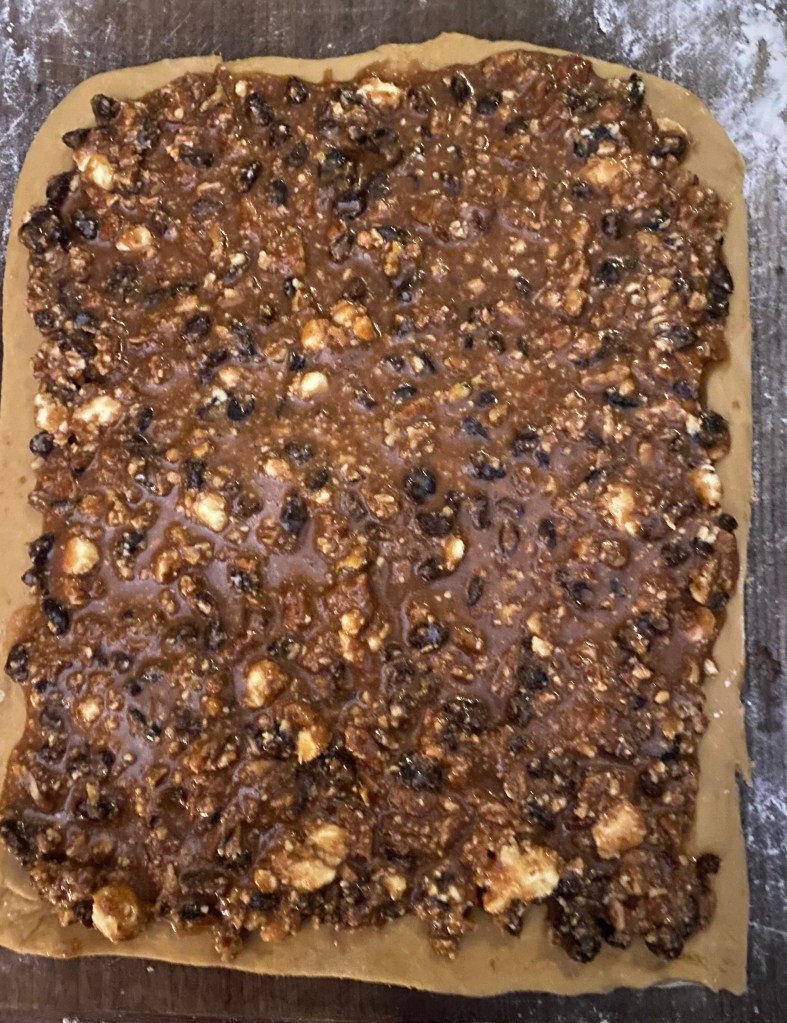 6. In a separate bowl mix butter, honey, maple syrup, orange zest, cinnamon, pecans, and raisins. Spread the mixture evenly over the dough.