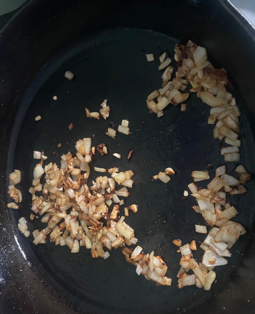 3. In the same skillet, add the chopped onion and garlic. Sauté for about 3-4 minutes until softened.