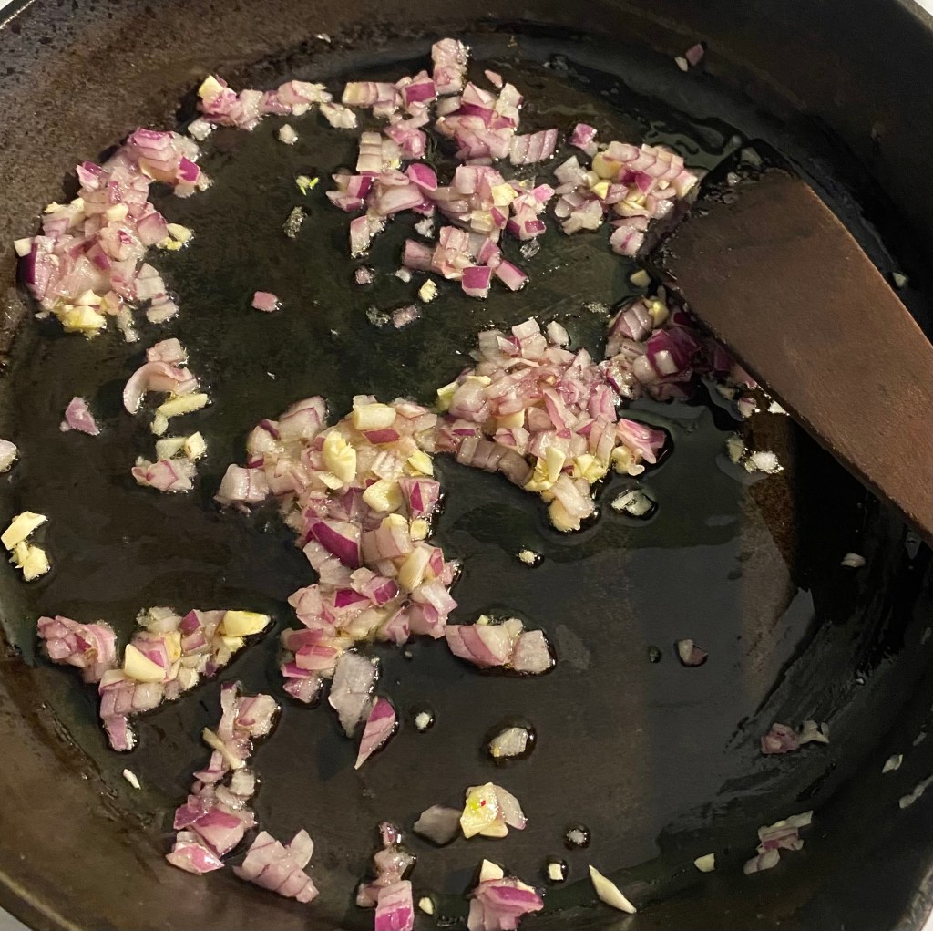 - Sauté garlic and onion in olive oil in cast iron (or oven safe) skillet until tender.