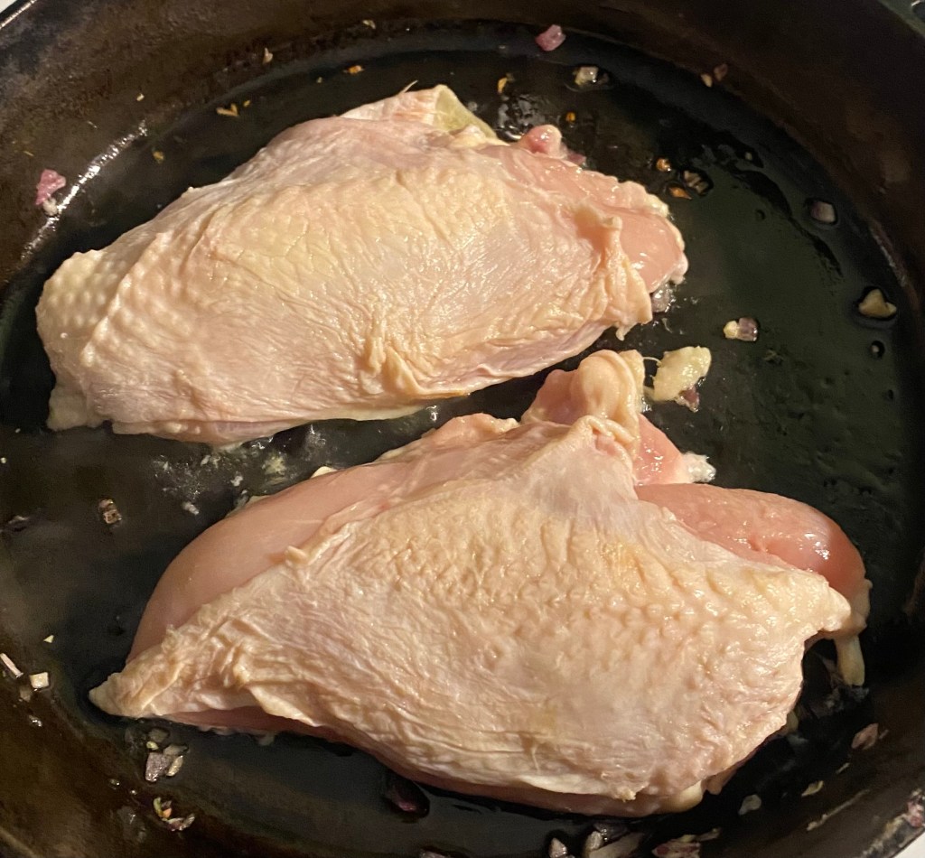 - Return the chicken to the skillet and sprinkle with salt, pepper, and thyme.