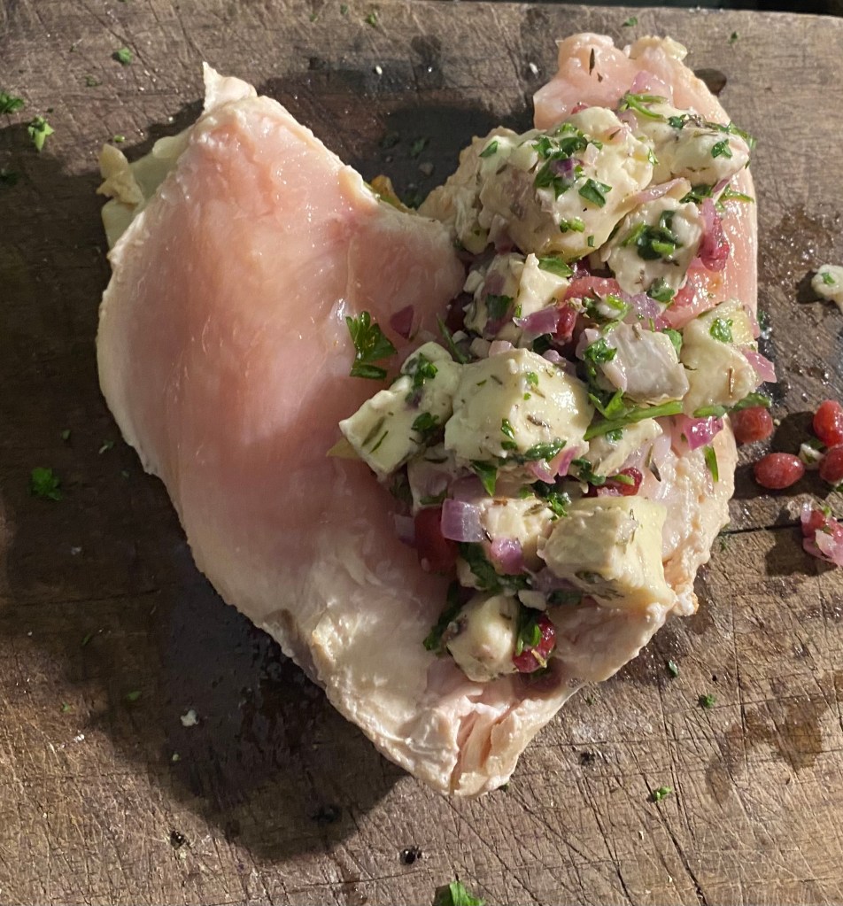 - Remove the chicken from heat and butterfly the chicken breasts by slicing them horizontally but not all the way through. Splay open, fill with brie mixture, and pin closed with toothpicks.