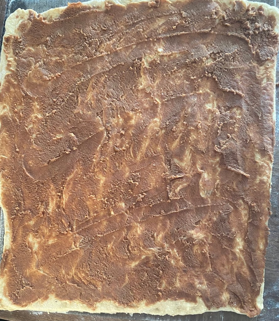 6. Once the dough has risen, roll it out on a floured surface into a rectangle about 1/4 inch thick. Spread the filling evenly over the dough.