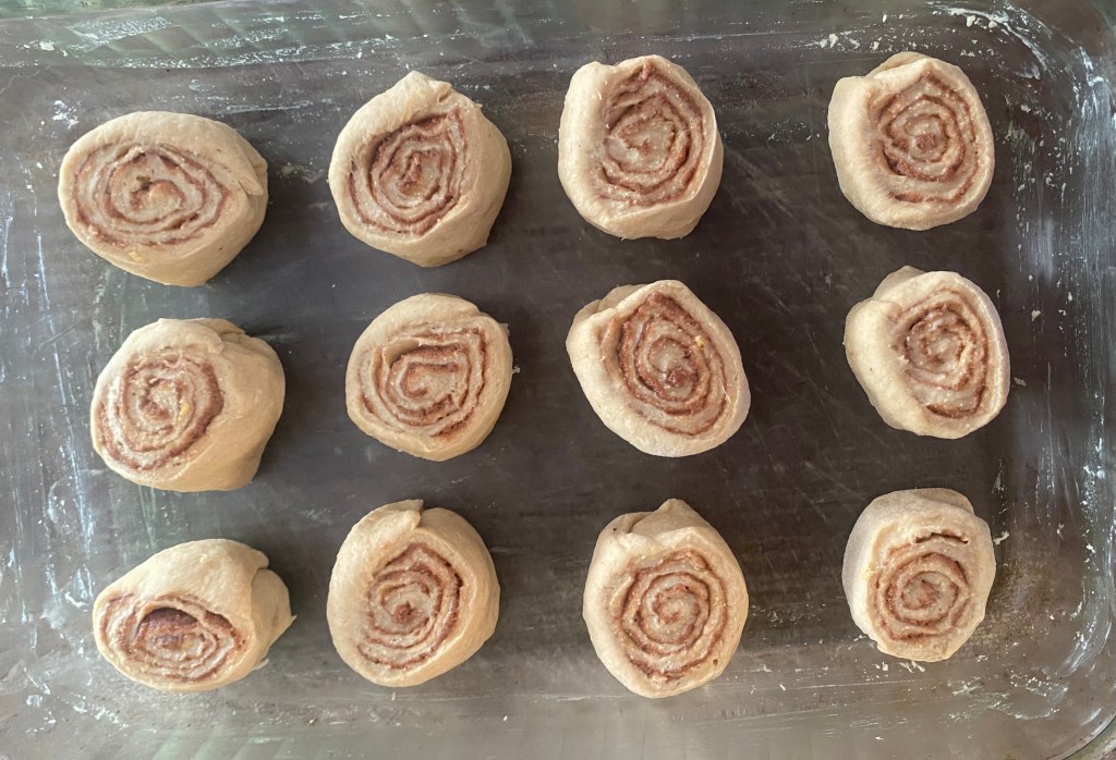 7. Roll the dough tightly from the long side, then slice it into 12 equal rolls. Place the rolls in a greased baking dish, cover, and let them rise for another 30 minutes.