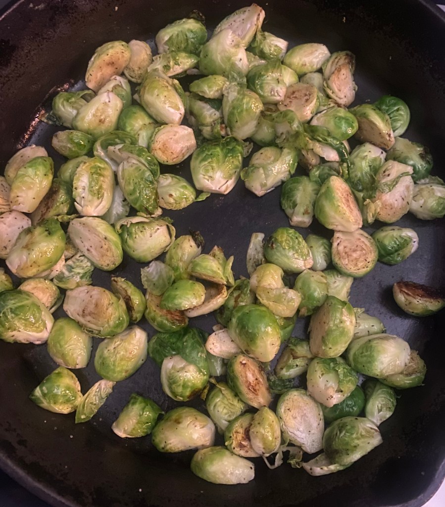 1. In a large skillet, heat the olive oil over medium heat. Add the halved Brussels sprouts and season with salt and pepper. Cook for about 5-7 minutes, allowing them to brown and caramelize.