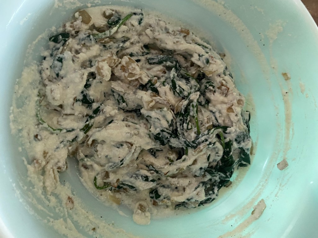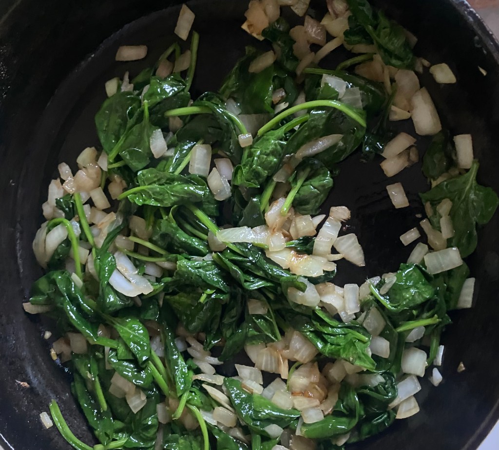 - Sauté onions in olive oil until translucent, about 5 minutes. Add spinach and cook until wilted.