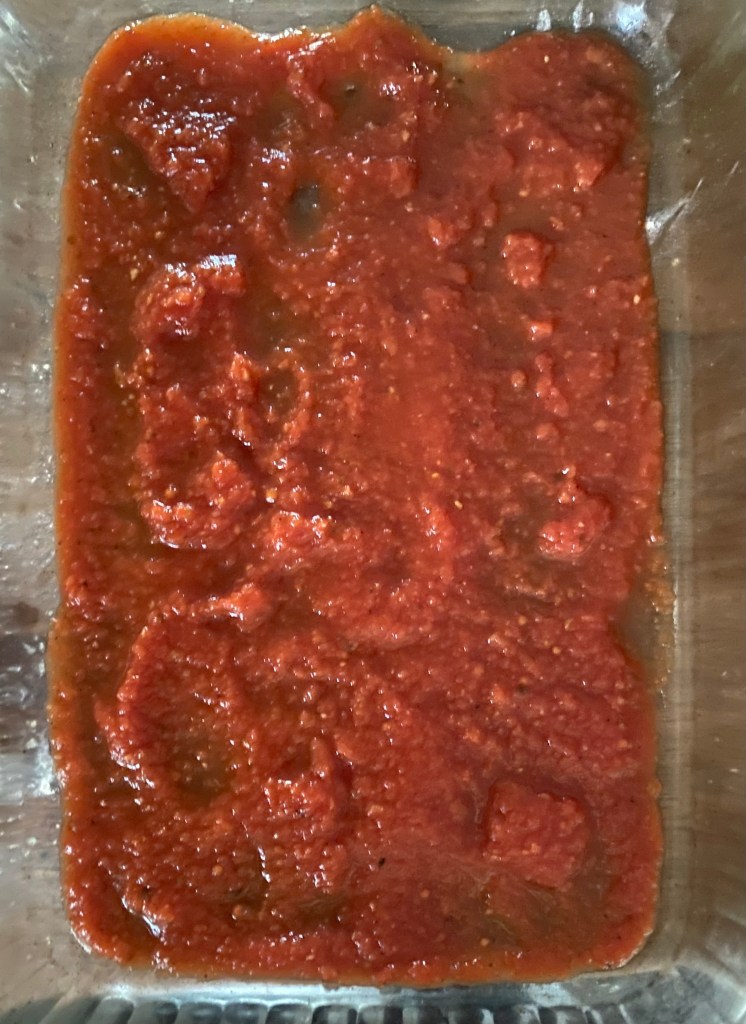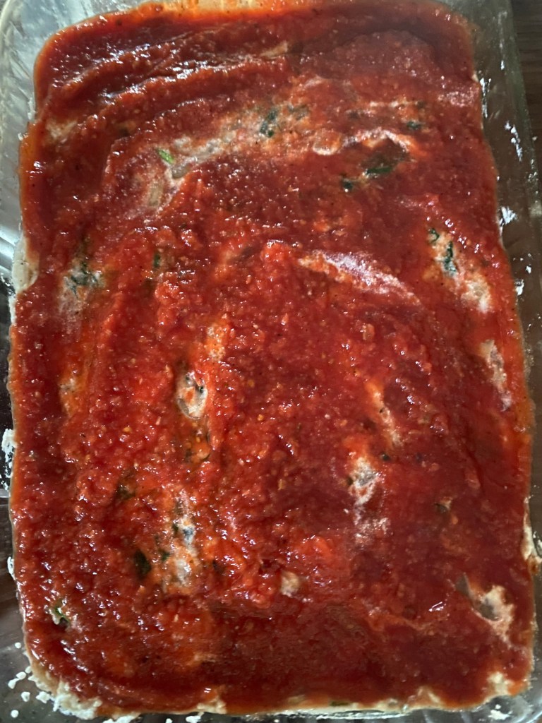 - Spread a thin layer of marinara sauce on the bottom of a greased 9×13-inch baking dish.