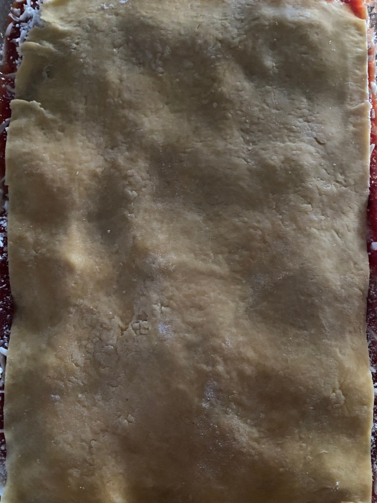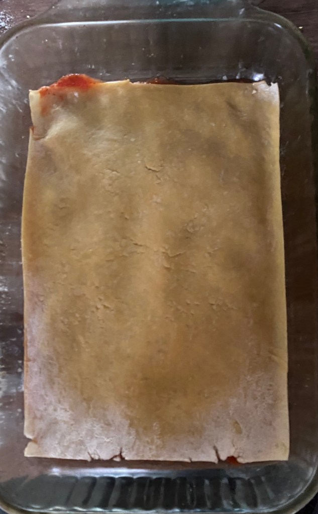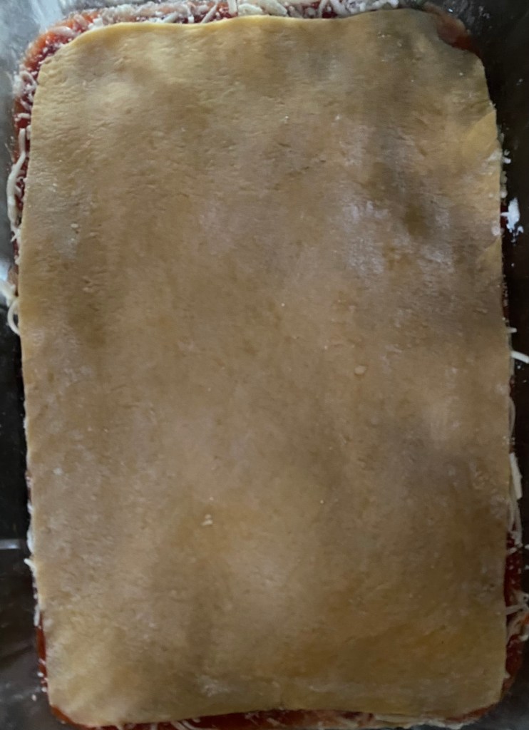 - Place a layer of homemade pasta sheets over the sauce, covering it completely.