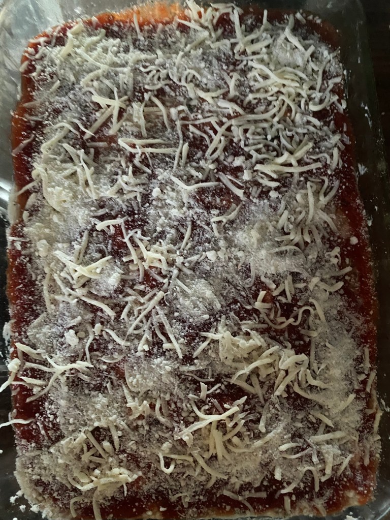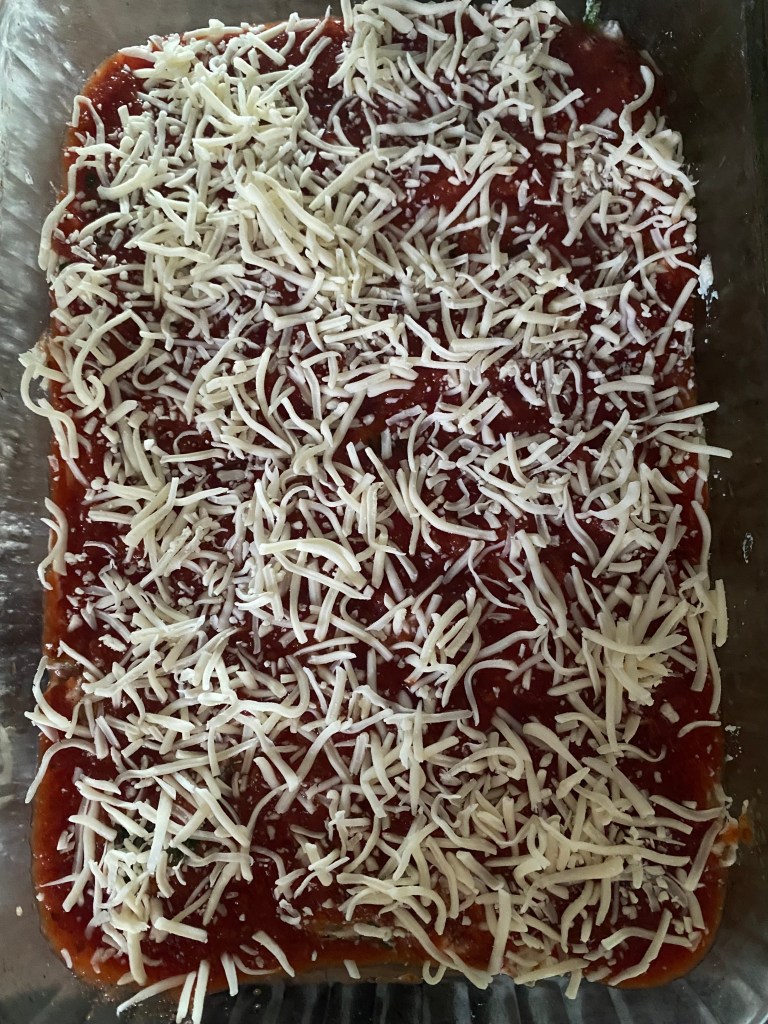 - Sprinkle additional mozzarella and Parmesan cheese over the top of the final layer of sauce.