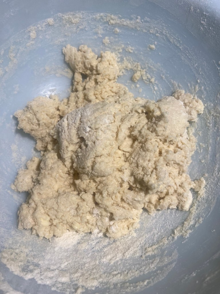 6. Turn the dough out onto a lightly floured surface and knead gently a few times until it comes together. Pat the dough into a circle about 1-inch thick.