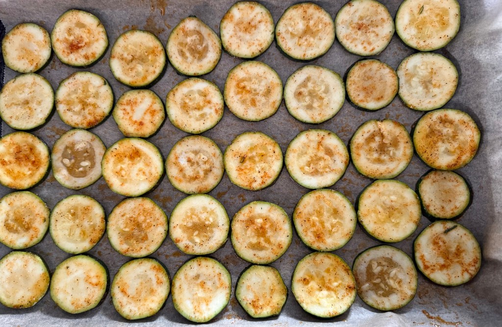 4. Arrange the zucchini slices in a single layer on the prepared baking sheet, ensuring they don’t overlap
