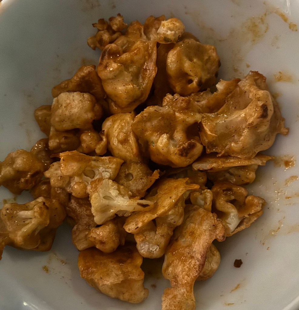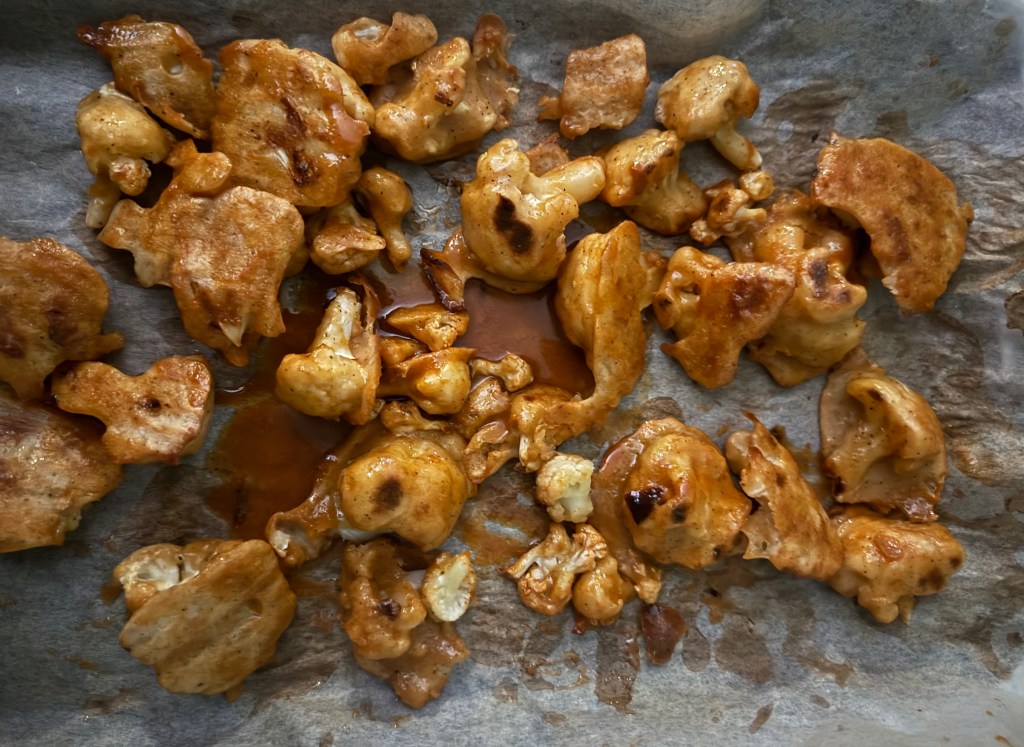 4. Bake for 20-25 minutes, or until the cauliflower is tender and the batter is crispy, flipping halfway through for even cooking.