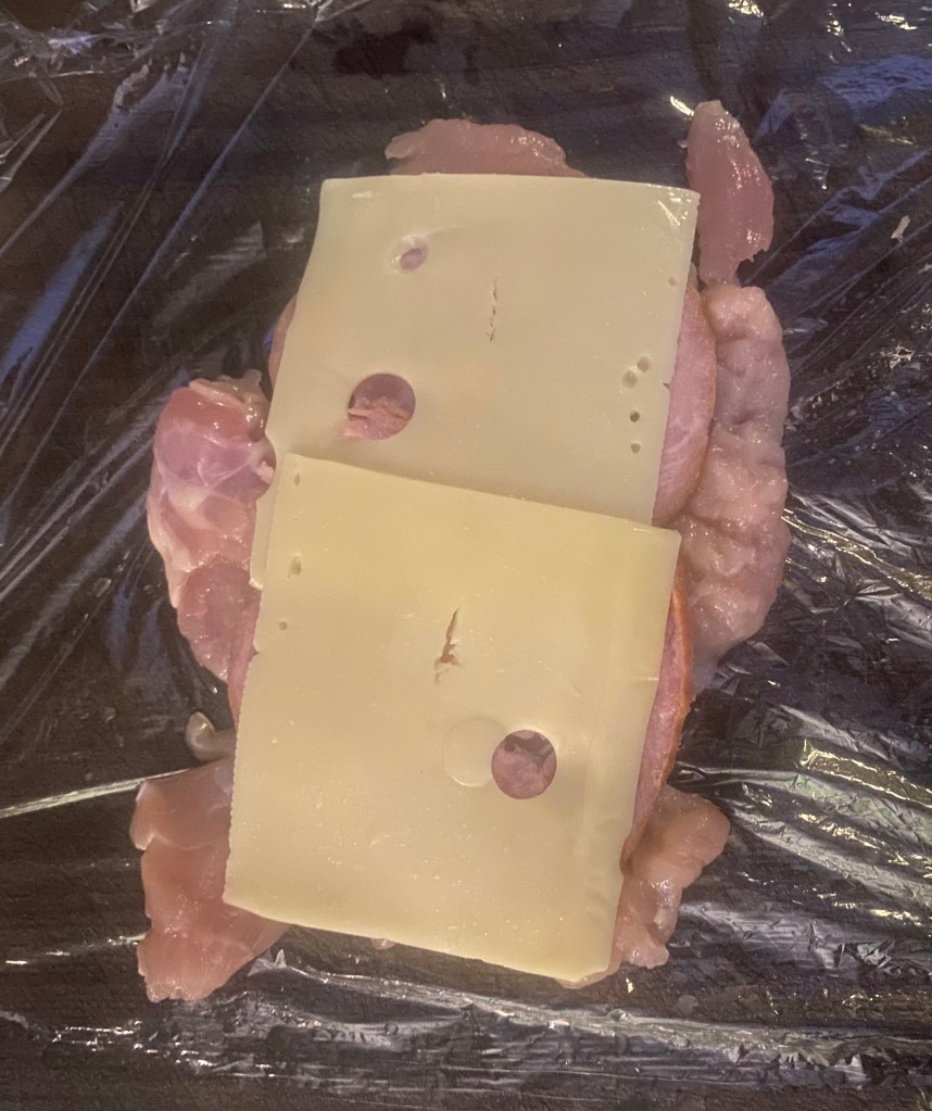 3. Season the chicken with salt and pepper, then layer each breast with 2 slices of ham and 2 slices of cheese