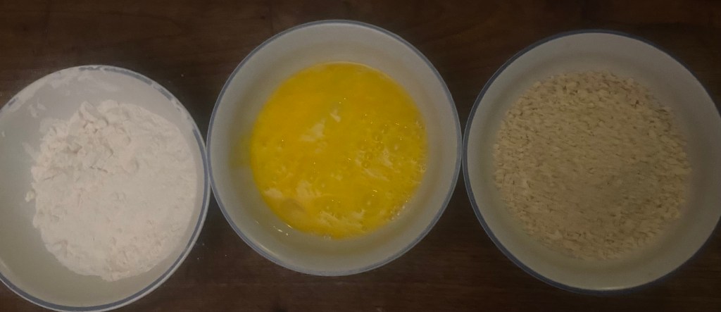 5. Dredge each rolled chicken breast in flour, then dip in beaten eggs, and finally coat with breadcrumbs