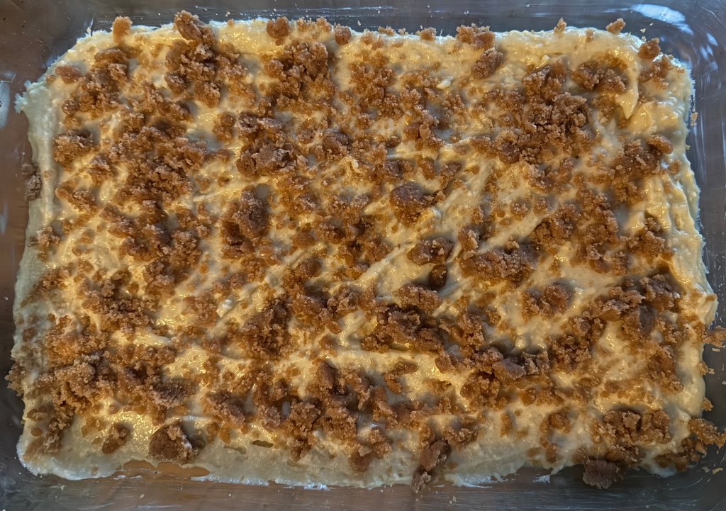 5. Pour half of the cake batter into the prepared baking pan and spread it evenly. Sprinkle half of the streusel topping over the batter. Pour the remaining cake batter on top and spread evenly, then finish with the remaining streusel topping.
