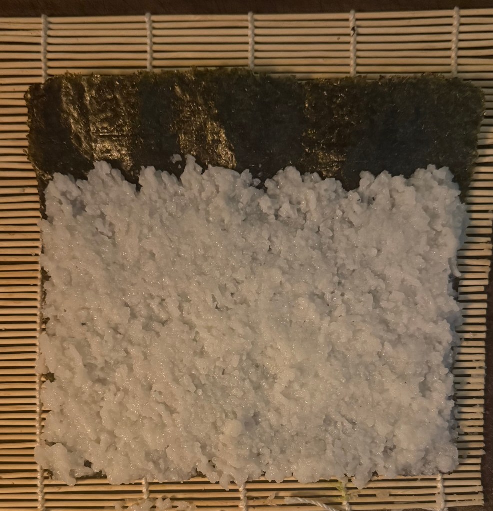 - Place a bamboo sushi mat on a flat surface and lay a sheet of nori on top, shiny side down. Spread a thin layer of brown rice over the nori, leaving about an inch at the top edge.