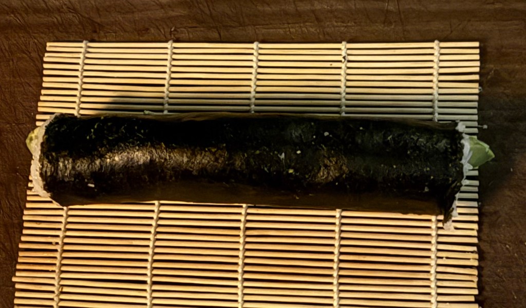 - Arrange slices of avocado, cucumber, and crab along the bottom edge of the rice. Using the mat, carefully roll the sushi away from you, pressing gently but firmly to keep the roll tight.