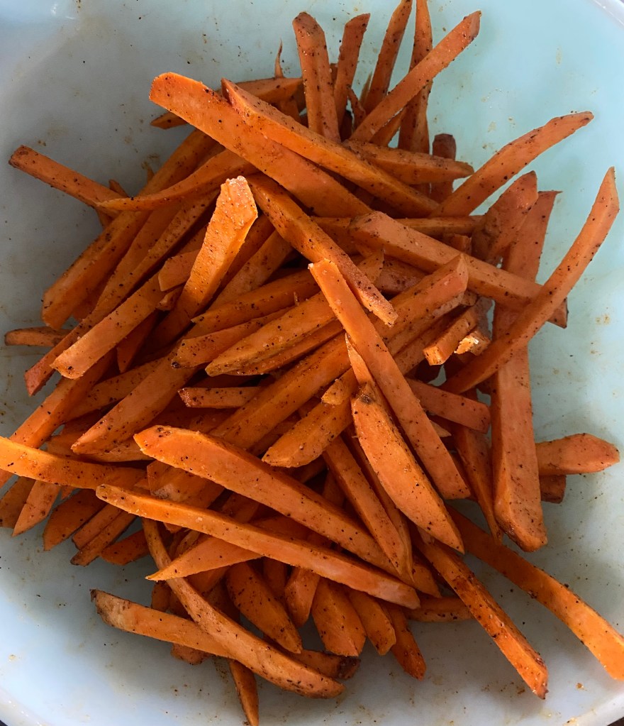 2. In a large bowl, toss the sweet potato fries with olive oil, paprika, garlic powder, salt, black pepper, and cayenne pepper (if using) until evenly coated.