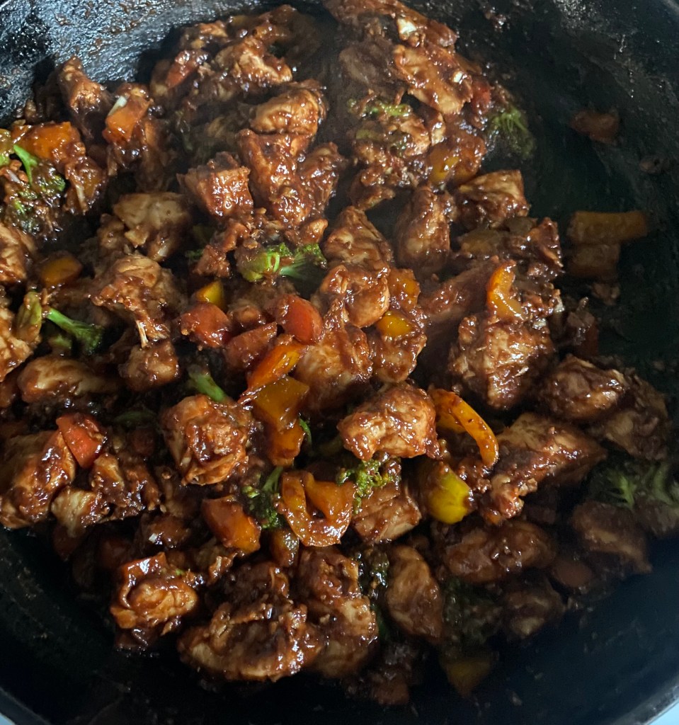 4. Pour the peanut sauce over the chicken and vegetables, stirring to coat everything evenly. Cook for an additional 2-3 minutes until heated through.