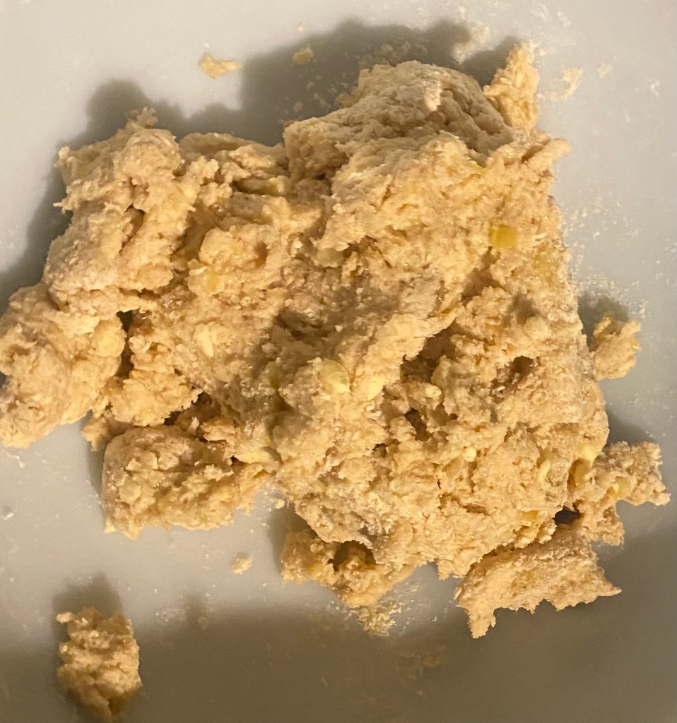 6. Turn the dough out onto a lightly floured surface and knead gently a few times until it comes together. Pat the dough into a circle about 1-inch thick.