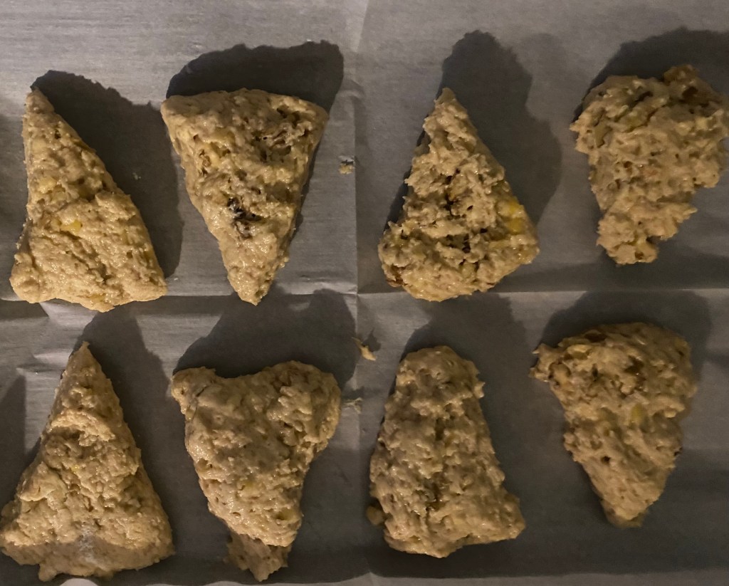 7. Cut the dough into triangles or use a round cutter to cut out scones. Place them on the prepared baking sheet.