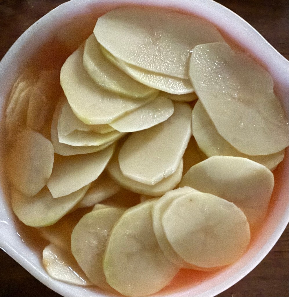 2. Soak in Vinegar: Place the potato slices in a large bowl and cover them with water and the white vinegar. Let them soak for at least 30 minutes to an hour to enhance the flavor and help remove excess starch.