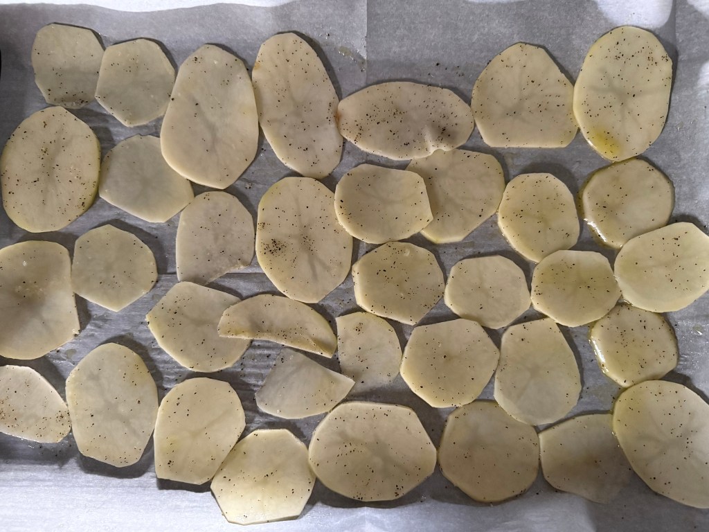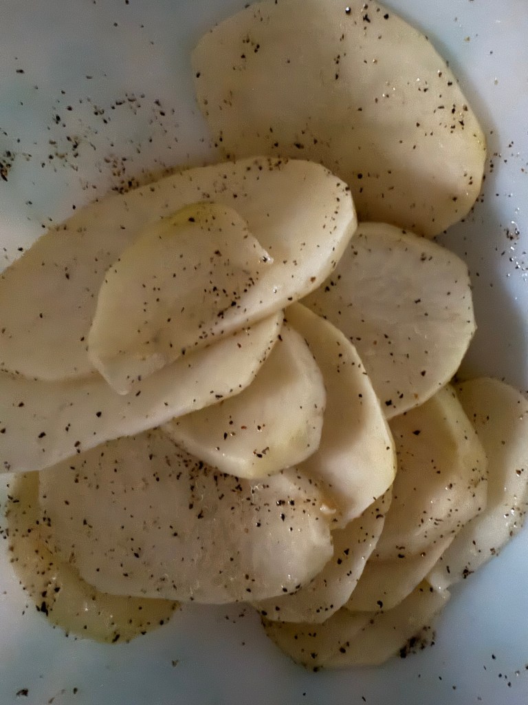 3. Drain the potato slices and toss with olive oil (if using), sea salt, and black pepper.