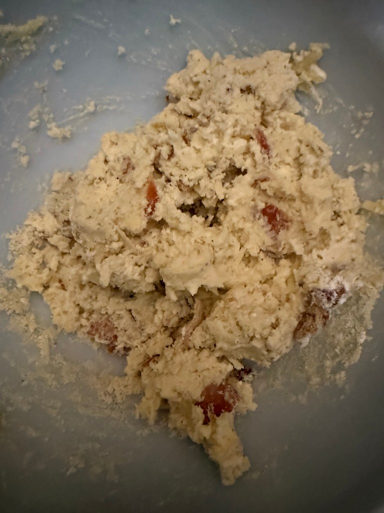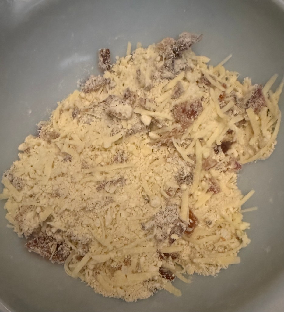 4. Gently fold in the shredded cheddar cheese and crumbled bacon until evenly distributed.