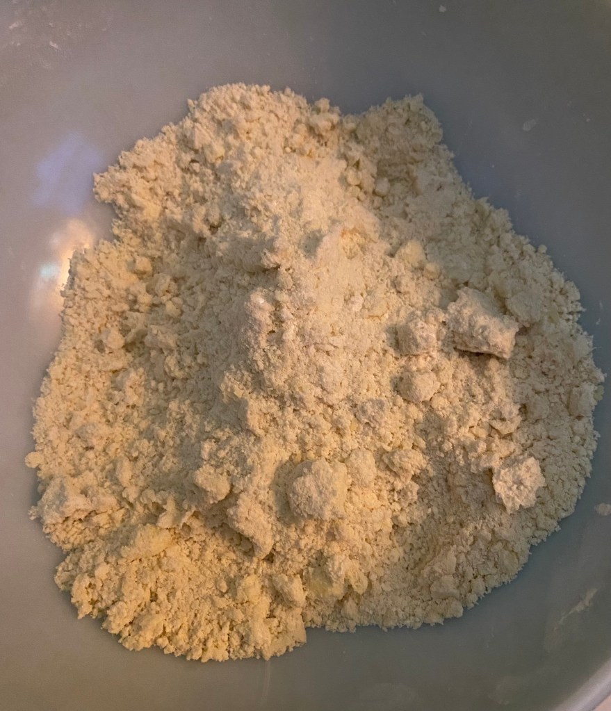 3. Add the cold, cubed butter to the flour mixture and use a pastry cutter or your fingers to blend until the mixture resembles coarse crumbs.