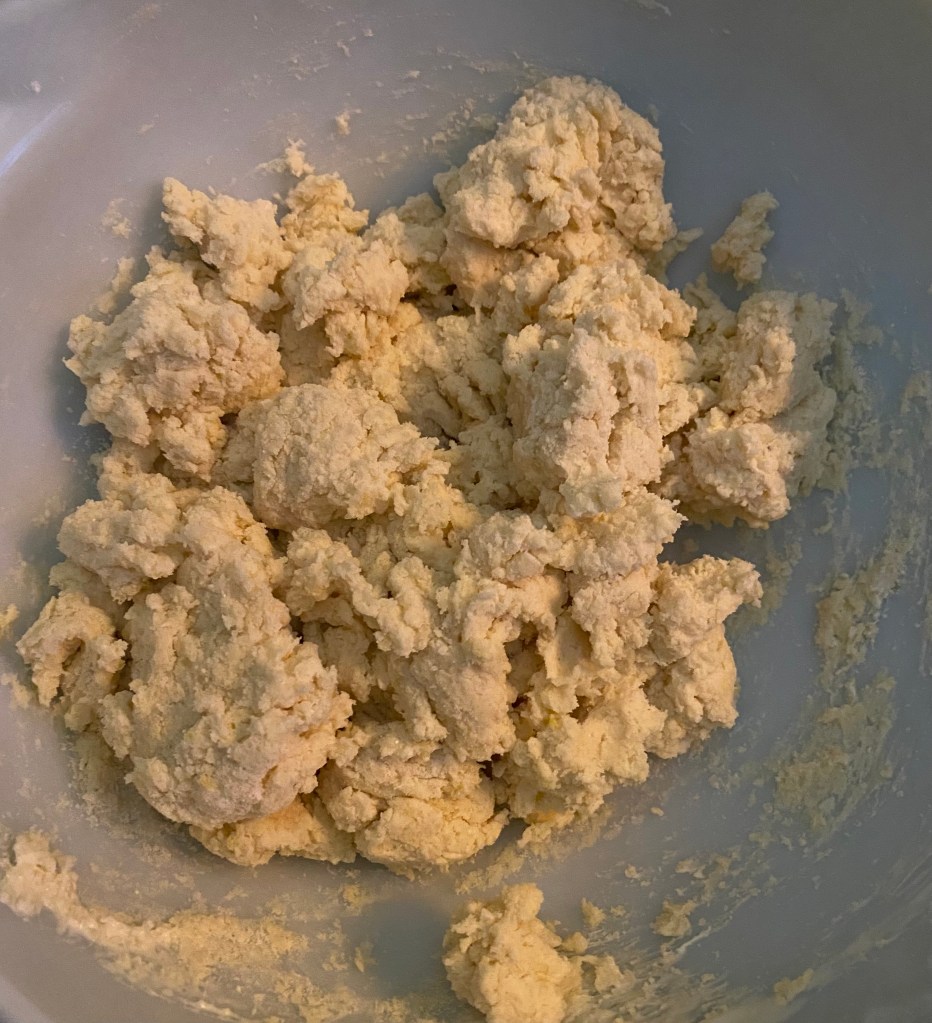 6. Turn the dough out onto a lightly floured surface and knead gently a few times until it comes together. Pat the dough into a circle about 1-inch thick.