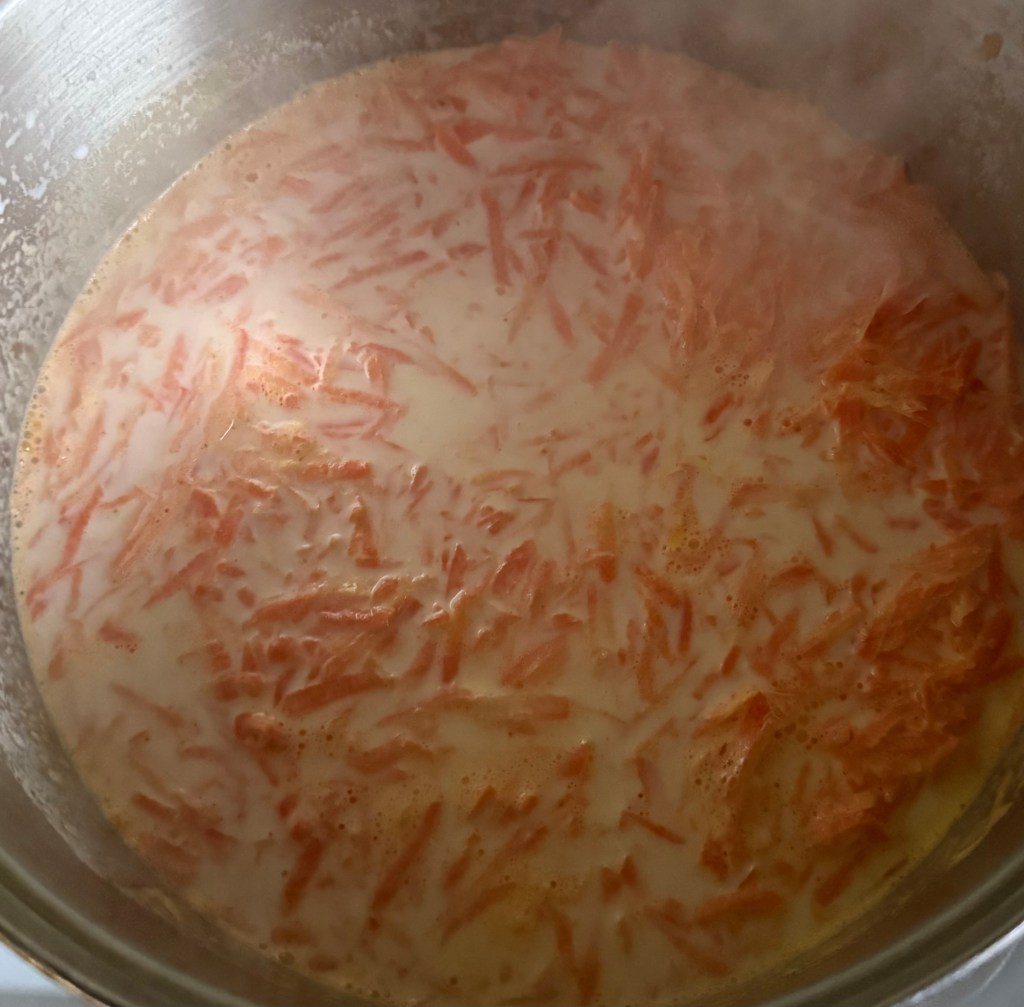 1. In a heavy-bottomed pan, add the grated carrots and whole milk. Cook over medium heat, stirring occasionally, until the mixture thickens and the milk reduces, about 30-40 minutes.