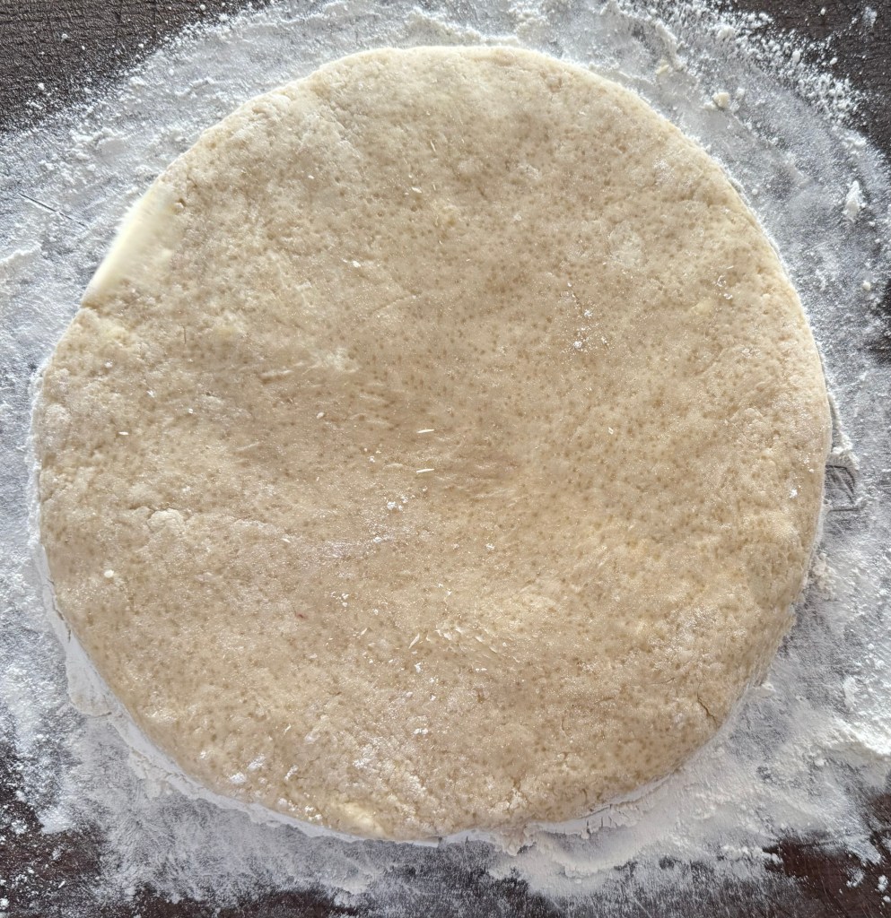 5. Turn the dough out onto a lightly floured surface and knead gently a few times until it comes together. Pat the dough into a circle about 1-inch thick.