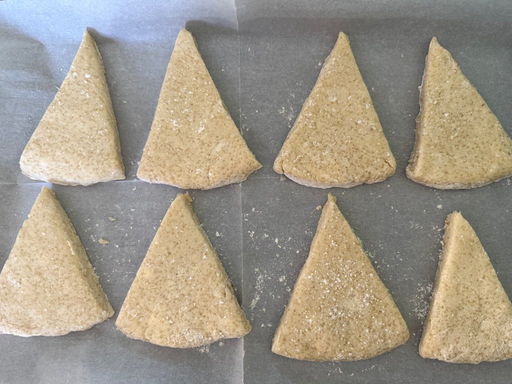 6. Cut the dough into triangles or use a round cutter to cut out scones. Place them on the prepared baking sheet.