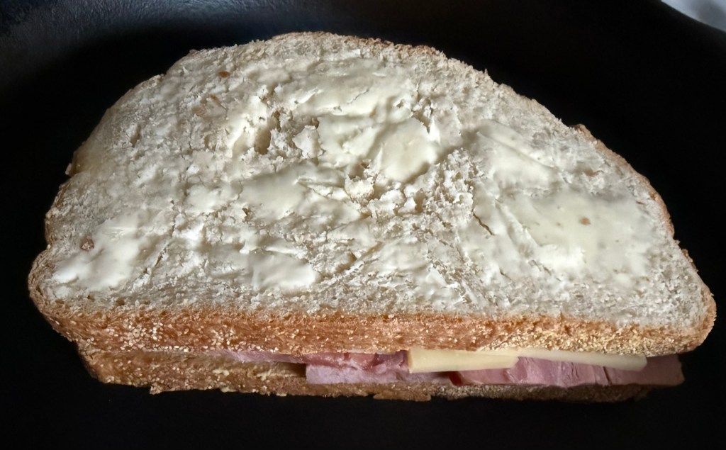 3. Spread softened butter on one side of each slice of bread. On the unbuttered side, spread Dijon mustard if using, then layer ham and cheese on four slices.