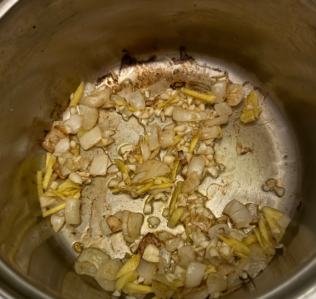2. Add the minced garlic and sliced ginger, cooking for an additional minute until fragrant.